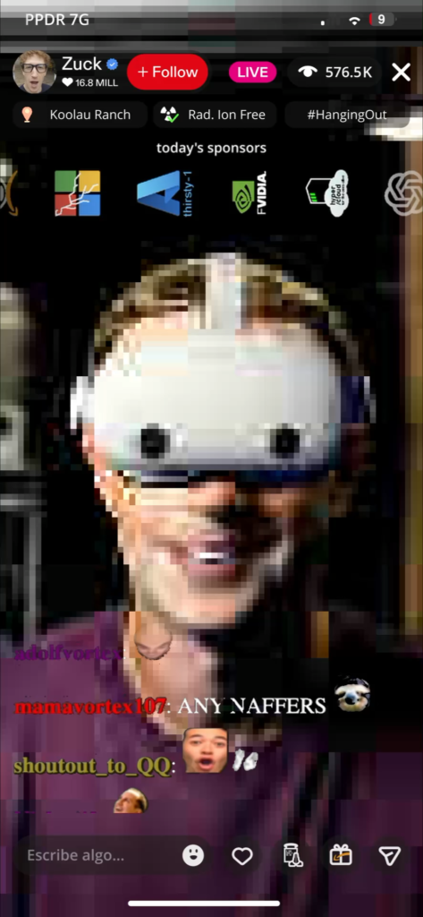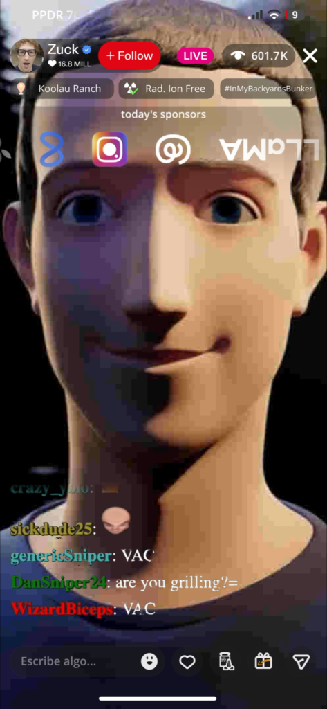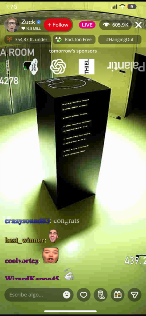 A cyberpunk Mark Zuckerberg Livestream. The use of generative AI acts as a remix tool, playing with discourses and Big Tech imaginaries to turn them around and show their contradictions. The project deploys an exercise in worldbuilding and scenario design, creating a dystopian universe that parodies the promises of technoutopia, while appealing to the audience’s imagination to think of alternative futures.